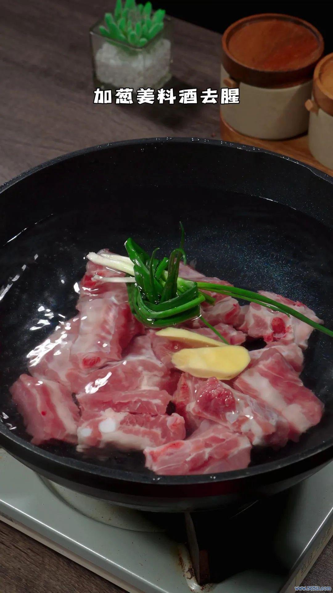 排骨冷水下锅,加葱姜料酒去腥,焯水5分钟捞出