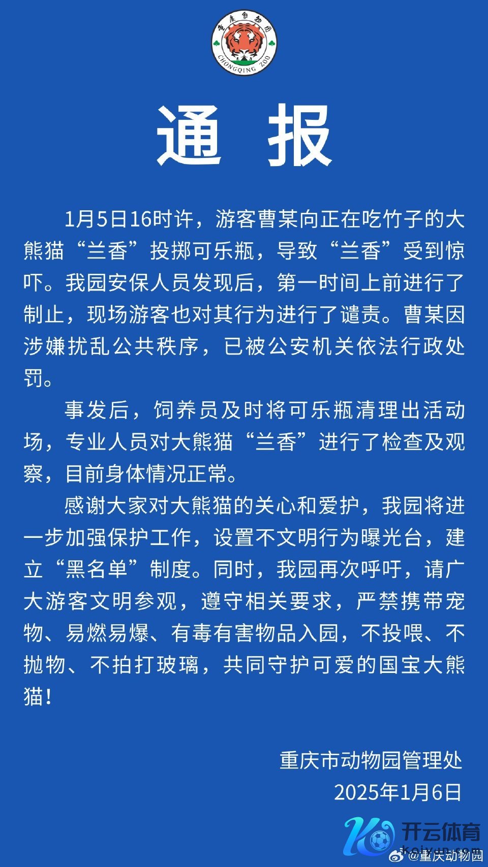 1月6日,重庆动物园发布“大熊猫被扔可乐瓶”情况通报,搭客曹某因涉嫌侵扰群众递次,被公安机关照章行政措置。
