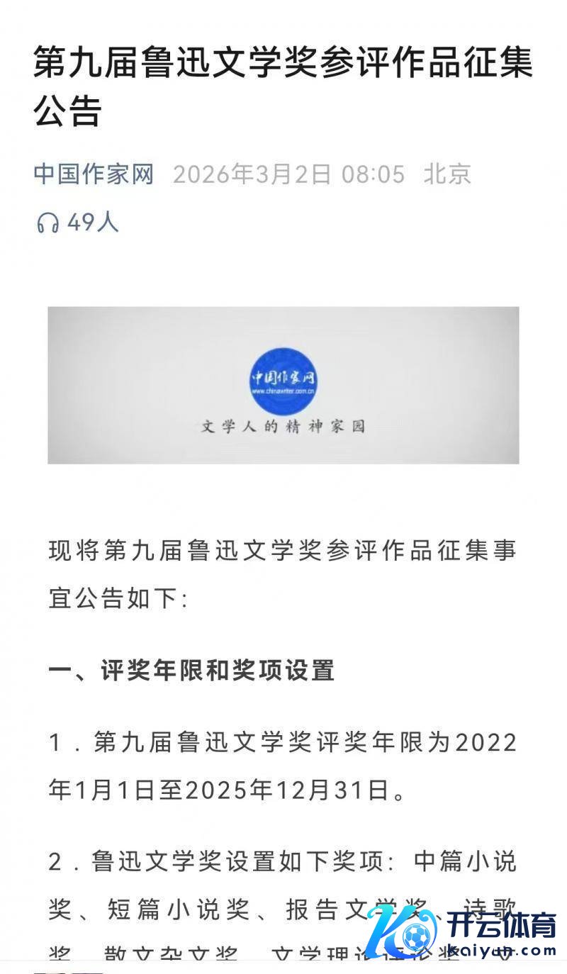 2026年3月2日,中国作者网发布第九届鲁迅文学奖参评作品搜集公告九游体育官网登录入口,将对响应新期间试验生存、塑造期间新东说念主形象、书写以中国式现代化全面鼓励中华英才伟大回话的作品等重心关爱。